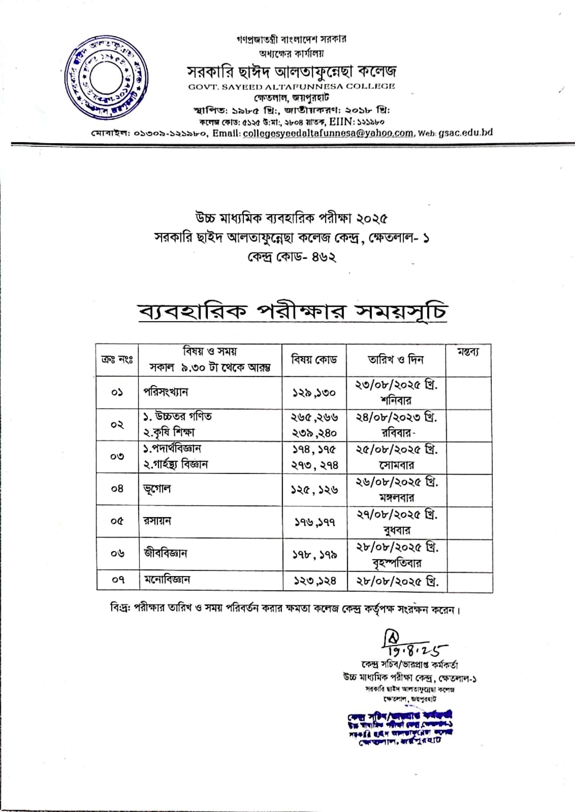 উচ্চ মাধ্যমিক পরীক্ষা ২০২৫ এর ব্যবহারিক সময়সূচি